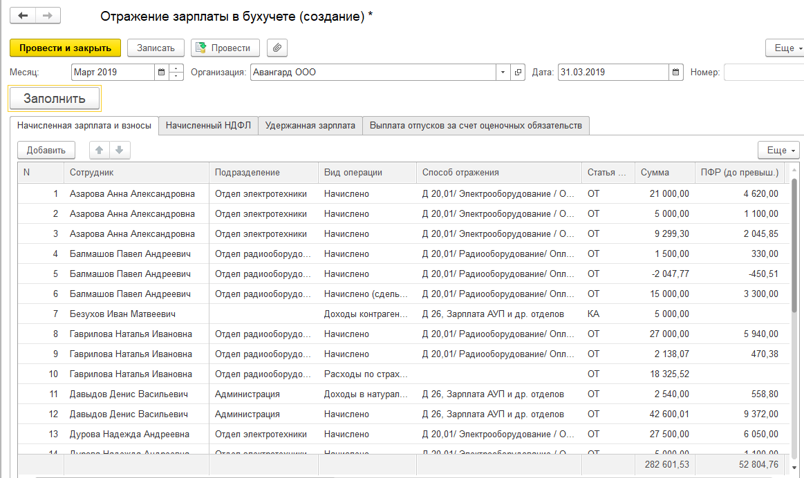 1. Создадим и автоматически заполним документ "Отражение зарплаты в учете".