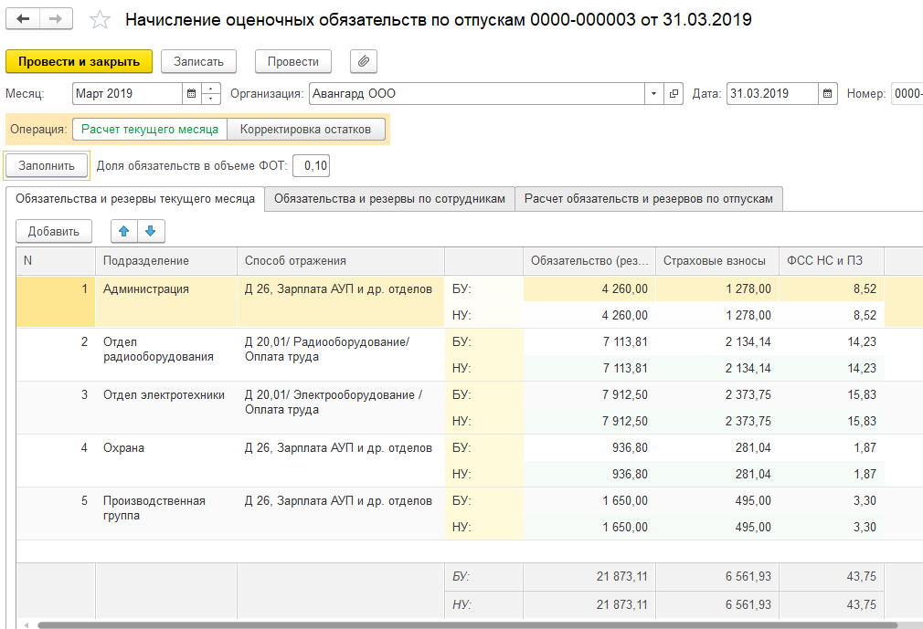 2. Создадим и автоматически заполним документ "Начисление оценочных обязательств по отпускам".