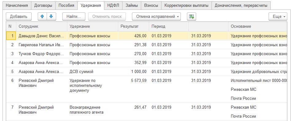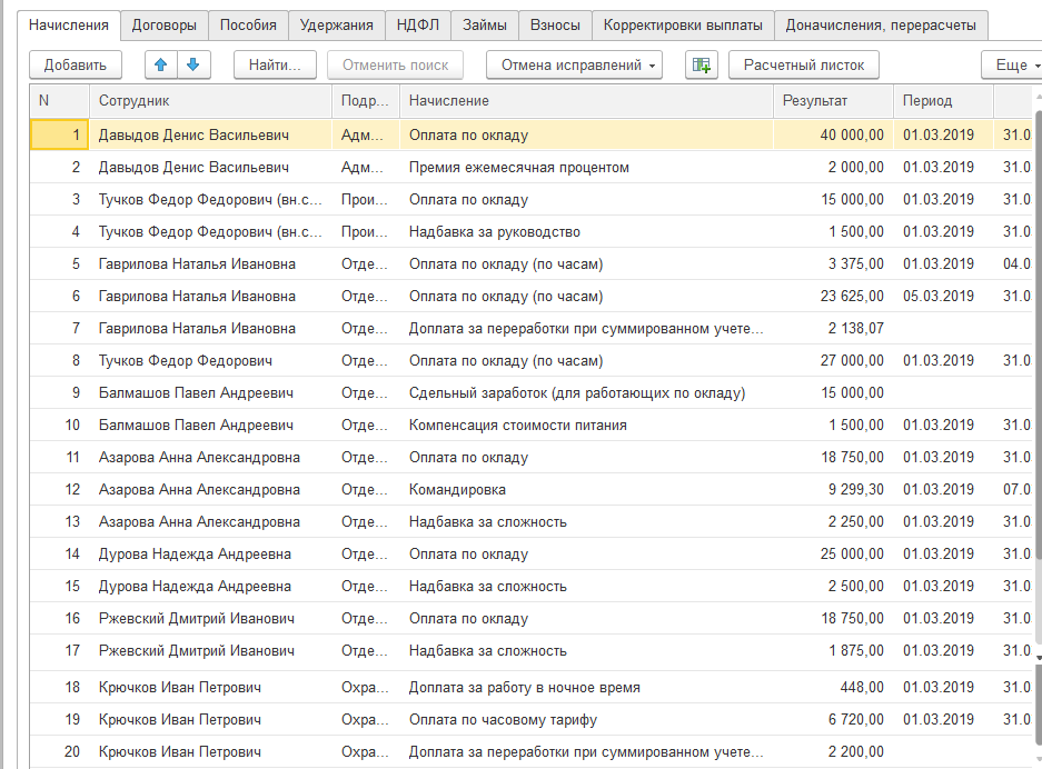 Проверка плановых начислений и разовых документов. К моменту окончательного расчета должны быть введены все кадровые приказы, все сведения о плановых начислениях (Зарплата/Изменение оплаты сотрудников, Отпуска по уходу за ребенком) и удержаниях (Зарплата/Алименты и другие удержания), разовые документы по отсутствиям сотрудников, а также по разовым начислениям (Зарплата/Все начисления и др.).