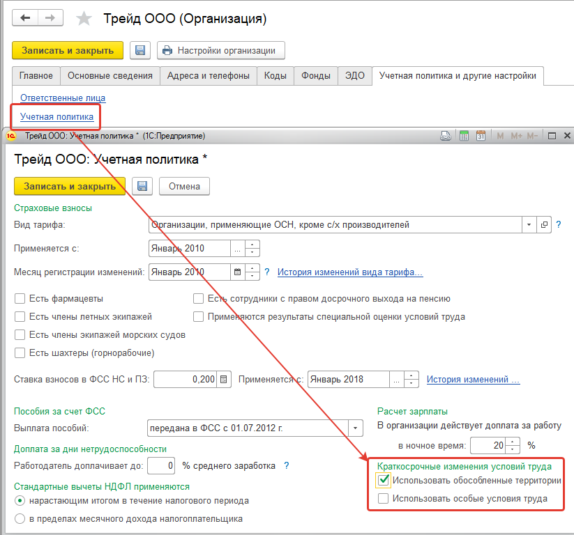 В программе реализована возможность перемещения сотрудников не только между подразделениями, но и между территориями с разным районным коэффициентом. Такая возможность включается в настройках учетной политики организации.