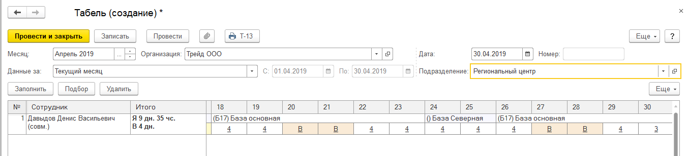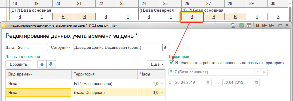При необходимости в табеле учета рабочего времени можно откорректировать рабочее время на той или иной территории, в том числе в рамках одного дня. Для этого создается документ "Табель учета рабочего времени".
