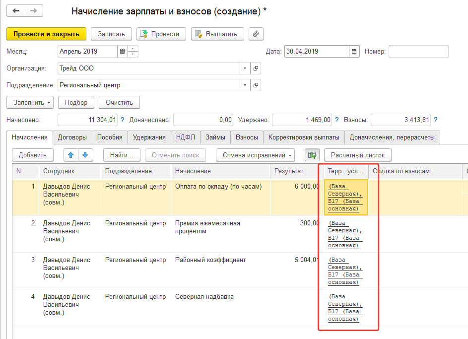 Если не введен табель учета рабочего времени, то работа на разных территориях в течение месяца будет учтена по графику работы с учетом документов-переводов.