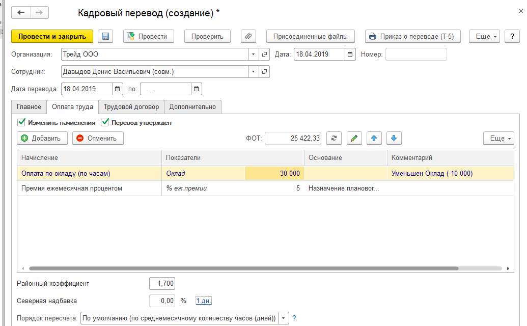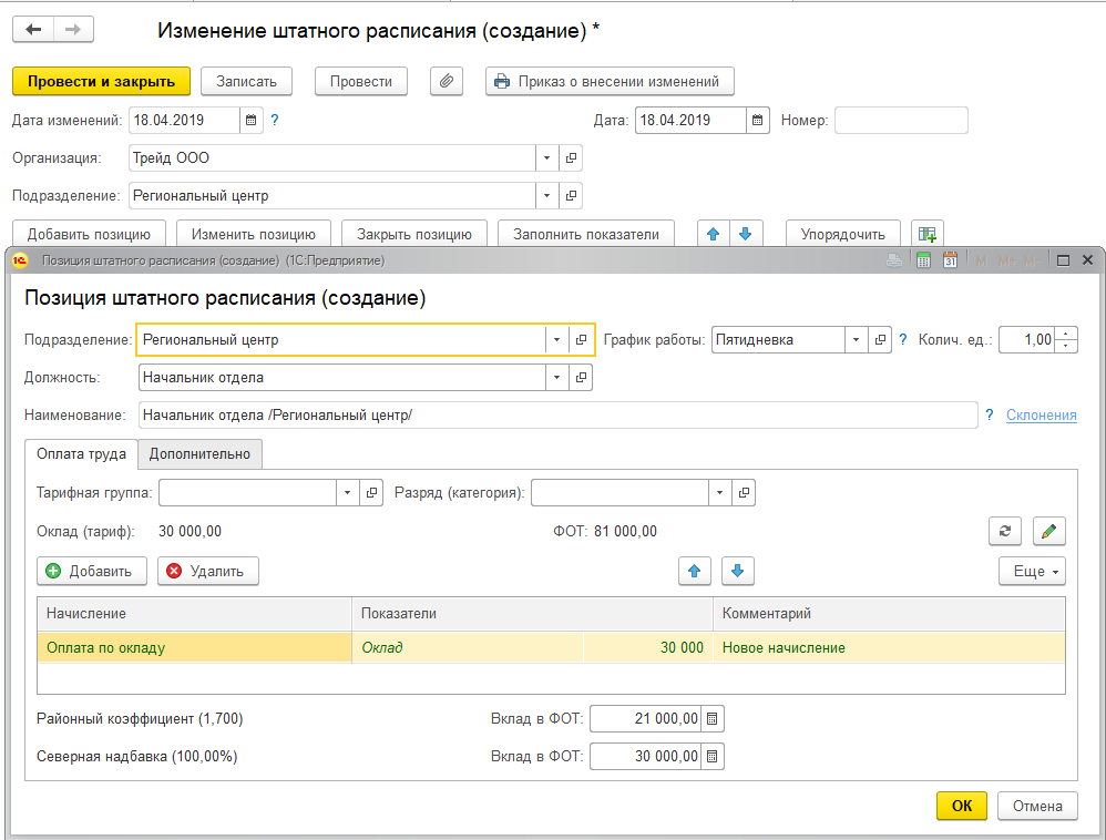 Например, в ООО "Трейд" есть региональный сервисный центр (он числится в расформированных подразделениях). С 18 апреля в нем открыта новая позиция в штатном расписании. По этой позиции предполагается начисление районного коэффициента в размере 1,7, исходя из настроек подразделения.