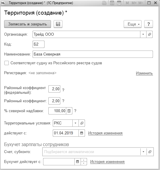 Для каждой территории указывается код, наименование, значения районных коэффициентов и северной надбавки, а также возможность уточнить отражение в бухгалтерском учете. Территорией также может быть судно из Российского реестра судов.