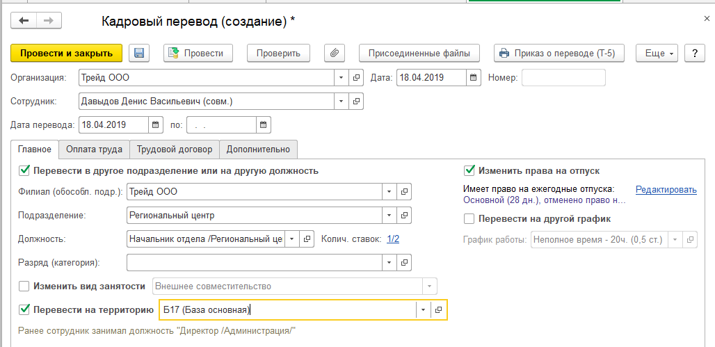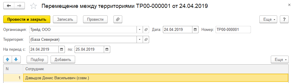В документе указывается территория, даты перевода (это может быть временный либо постоянный перевод). Например, сотрудник на 2 дня переводится на Базу северную, где РК=2.