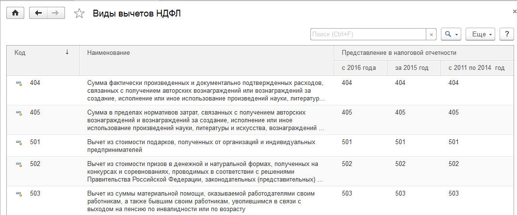 При исчислении НДФЛ налогооблагаемая база может быть уменьшена на сумму различных вычетов. Перечень всех вычетов хранится в справочнике "Виды вычетов НДФЛ" (раздел "Налоги и взносы").