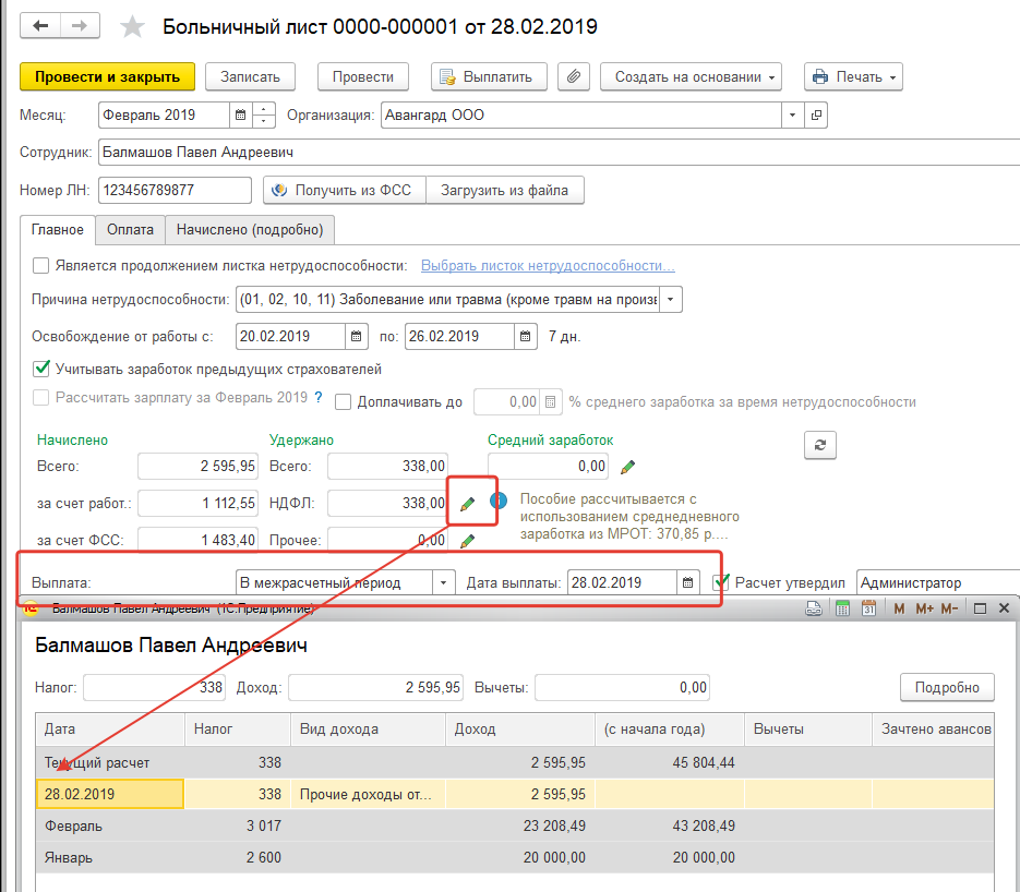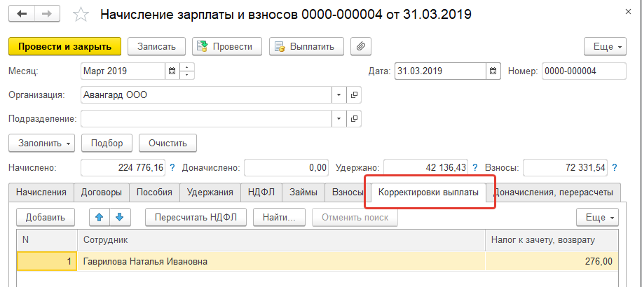 Данная информация будет также отражаться при начислении зарплаты на закладке "Корректировка выплаты".