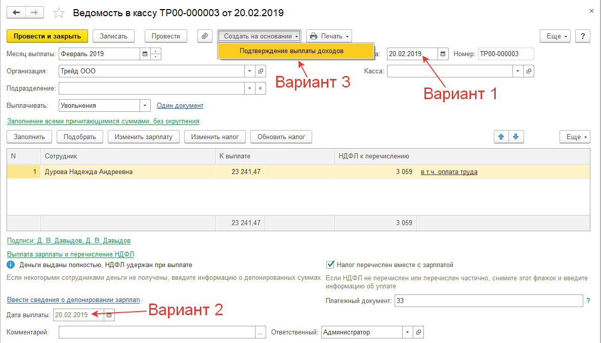 Вариант 2 – дата выплаты, отличная от даты ведомости (если выплата прошла позже, чем сделана ведомость)