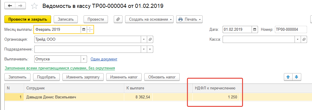 Окончательный расчет НДФЛ с учетом данных по всем введенным за месяц документам производится в документе "