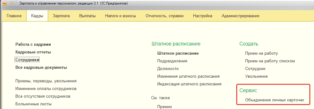 Для целей корректного учета НДФЛ дублирования физических лиц допускать нельзя. Если такая ситуация все же произошла, то можно воспользоваться сервисом объединения личных карточек (раздел "Кадры"). После объединения следует обязательно проверить расчет налога при ближайшем расчете зарплаты.