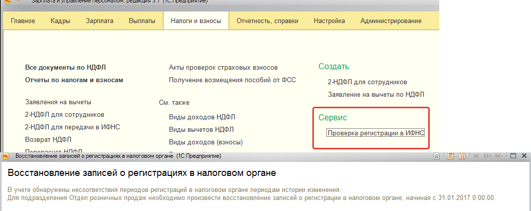 Важно следить за корректностью указания даты регистрации. Если сведения о регистрации в ИФНС указываются уже после расчета налога, то НДФЛ необходимо пересчитать. Если же НДФЛ регистрировался некорректно в течение длительного периода, то после уточнения сведений о регистрации в ИФНС для подразделения можно воспользоваться сервисом "Проверка регистрации в ИФНС" из раздела "Налоги и взносы".