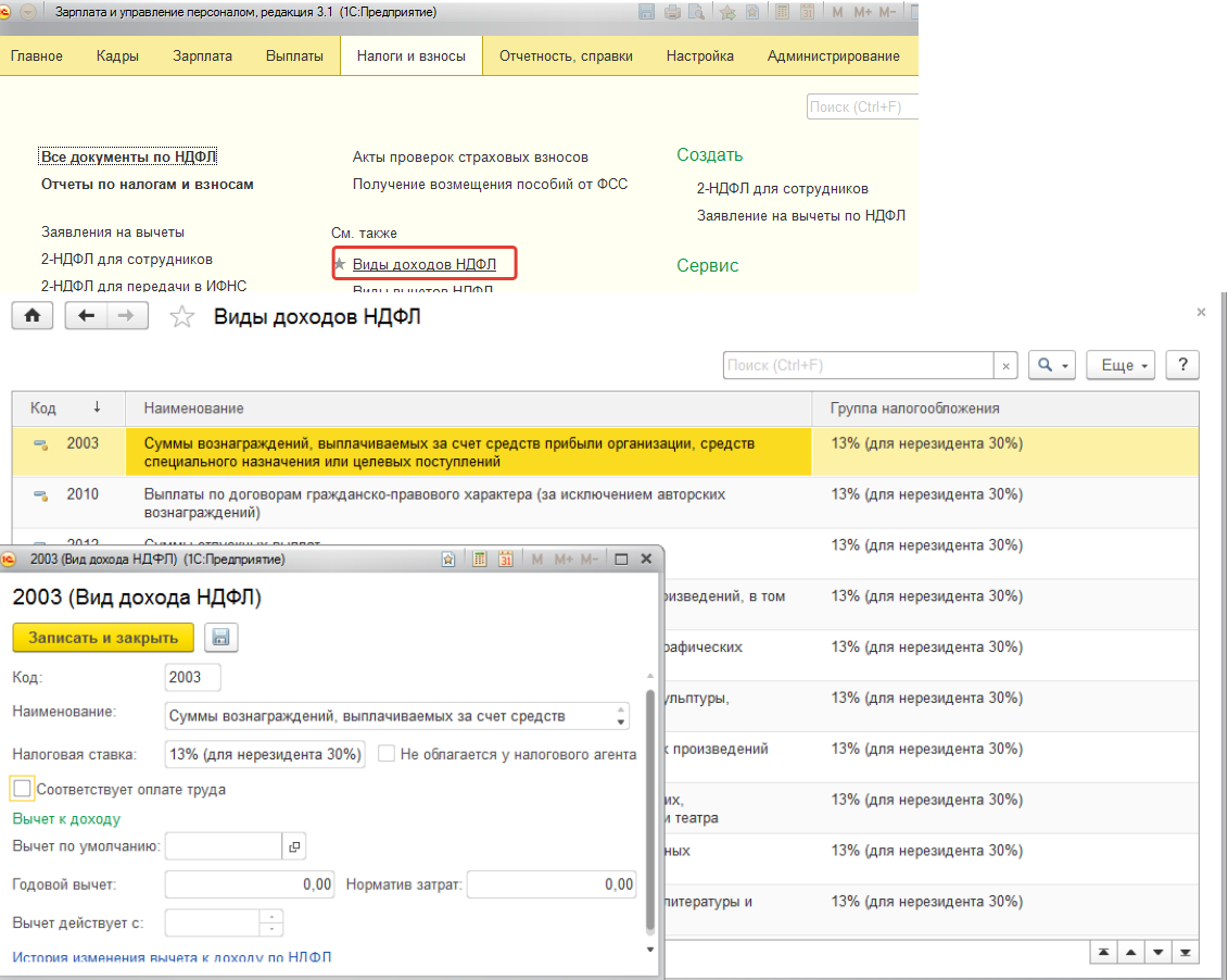 Для каждого начисления из плана видов расчета "Начисления" (раздел "Настройка") существует возможность уточнить порядок налогообложения НДФЛ: облагается ли начисление либо не облагается; если облагается, то по какому коду дохода.