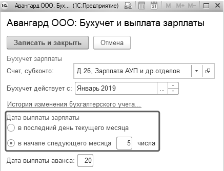Сроки выплаты зарплаты (т.е. даты фактической выплаты зарплаты), а также аванса по умолчанию настраиваются для каждой организации в разделе "Настройка / Организации / закладка "Учетная политика и другие настройки"/ Бухучет и выплата зарплаты". Однако если реальная дата выплаты дохода будет отличаться, то для доходов, не относящихся к категориям оплаты труда, дата получения будет в момент фактической выдачи.