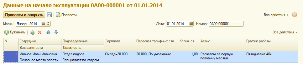 Документ "Данные на начало эксплуатации программы". Доступен в разделе "Кадры".