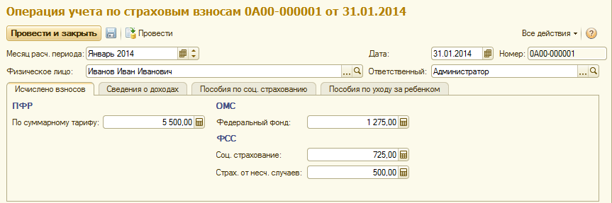 - Операция учета по страховым взносам - для каждого месяца создается отдельный документ, где указываются исчисленные взносы, сведения о доходах (облагаемая и необлагаемая база), а также сведения о назначенных государственных пособиях (для формирования отчетности в ФСС).