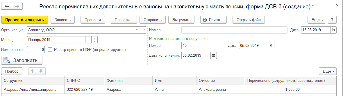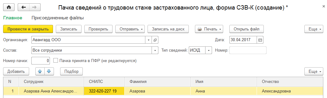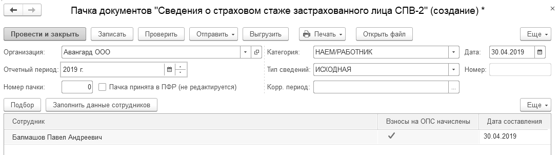 Проведение документа означает, что данные переданы в отделение ПФР. Пачку можно передать в архив, установив соответствующий флажок.