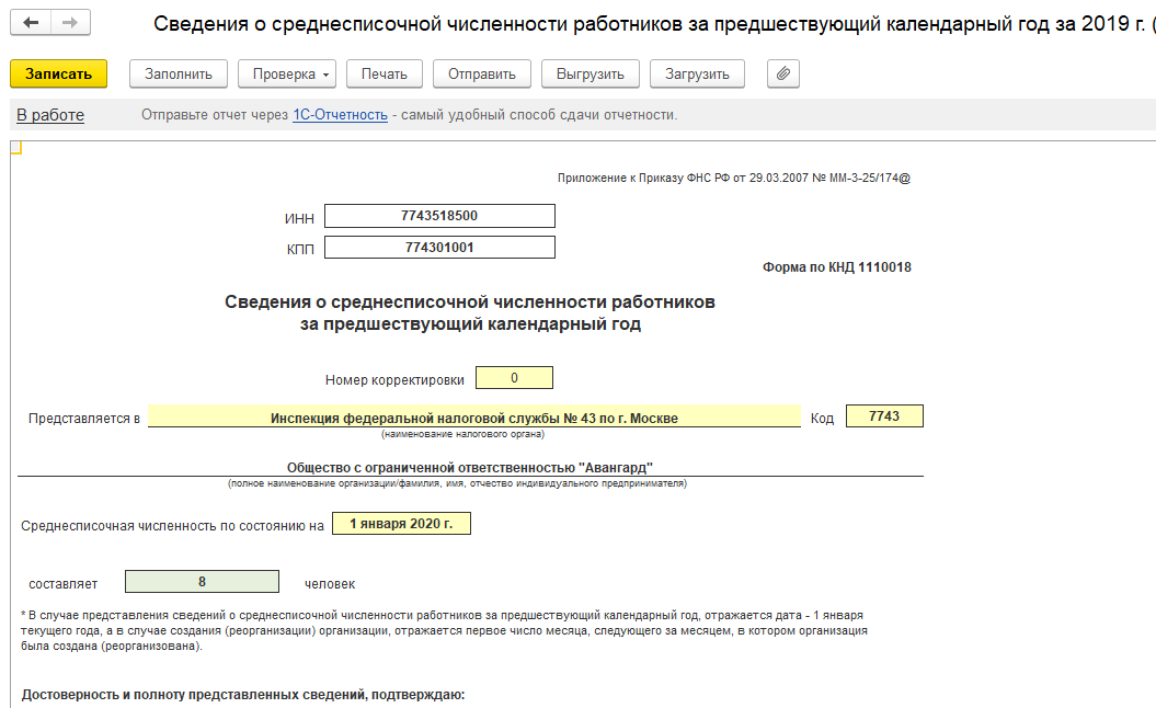С помощью инструмента 1С-Отчетность (или инструмента подготовки регламентированных отчетов) можно сформировать ежегодную отчетную форму для подачи в ИФНС сведений о среднесписочной численности. Данный отчет выбирается по команде "Создать" из папки "Отчетность прочая". Для отчета следует указать организацию и период составления отчета (год).