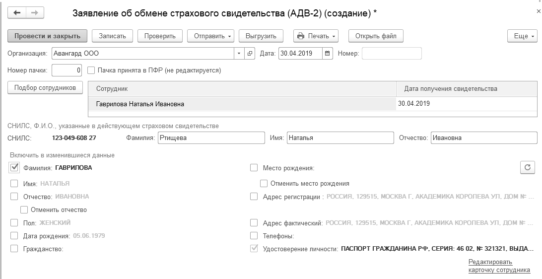 При выборе сотрудников заполняются их личные данные, если данные были введены корректно, то документ готов к отправке.