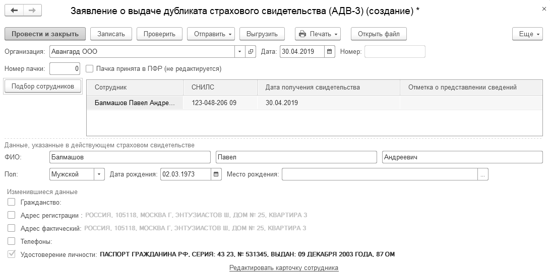 АДВ-3 передается в ПФР в случае утраты сотрудником страхового свидетельства. Документ заполняется произвольным списком по команде "Подбор сотрудников".