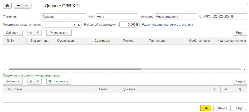 Для каждого сотрудника можно заполнить данные по соответствующей команде – заполняются как отметки о начислении взносов, так и сведения о стаже.