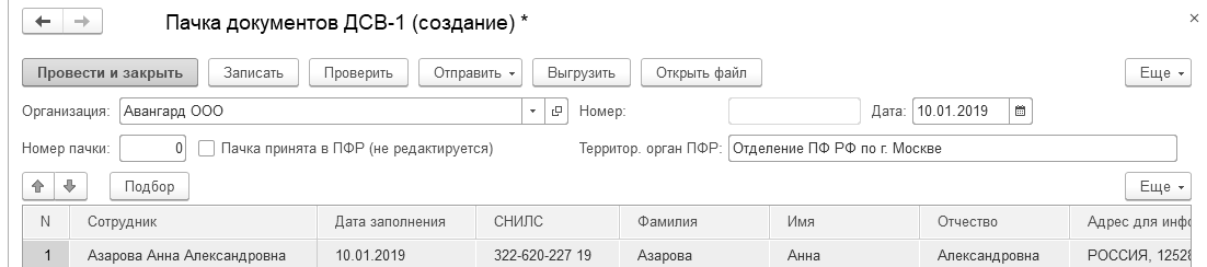 Пачки документов ДСВ-1". При создании документа указывается организация, ответственное лицо, а также наименование органа ПФР, куда подается заявление. В документе подбираются физические лица, подавшие заявления ДСВ-1, их личные данные заполняются автоматически.