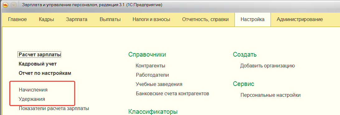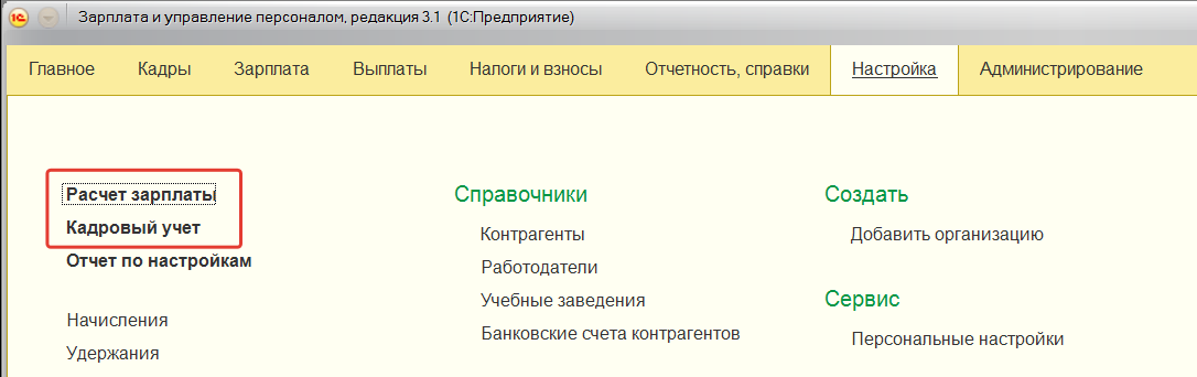 Поскольку программа рассчитана на ведение учета на предприятиях различного масштаба, в ней реализован широкий спектр различных возможностей. При начале работы с программой пользователь может настроить ее для своего предприятия таким образом, чтобы убрать лишние возможности и не загромождать программу невостребованным на текущий момент функционалом, либо напротив, использовать все предусмотренные возможности без исключения (тогда в разделах программы появятся дополнительные команды, будет открыт доступ к дополнительным документам и справочникам, будут добавлены новые начисления и т.п.). В последующем при необходимости можно будет изменить данные настройки.