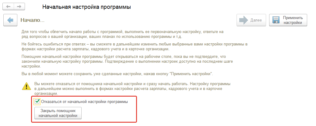 На следующем шаге выберем вариант "Отказаться от начальной настройки программы" и закроем помощник начальной настройки (если работа со стартовым помощником желательна, можно воспользоваться заданиями Приложения 6, однако потом следует завершить настройку и проверить настройки в меню программы).