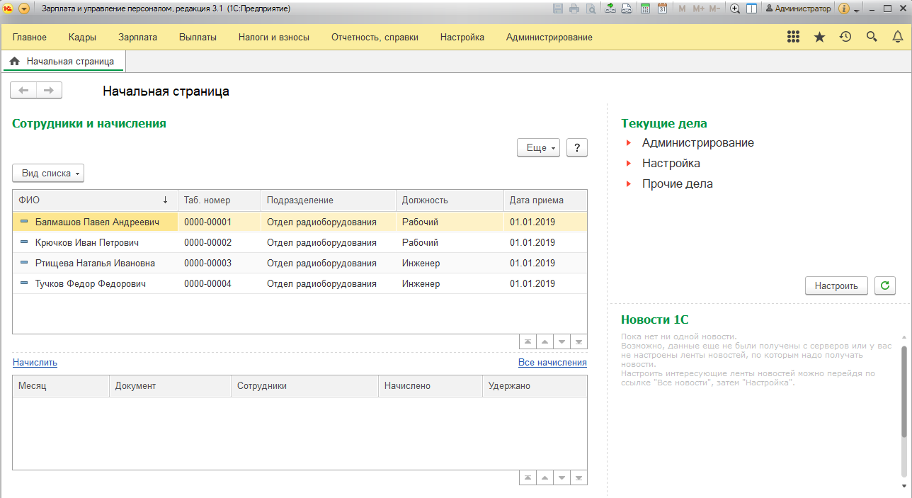 Обратите внимание, что в учебной базе уже создана организация и приняты на работу несколько сотрудников. Более подробно с составом данных в начальной базе можно познакомиться в Приложении 1.