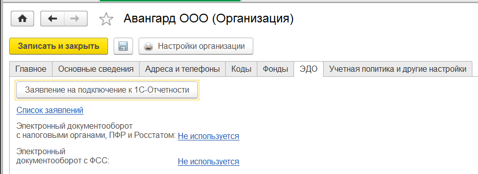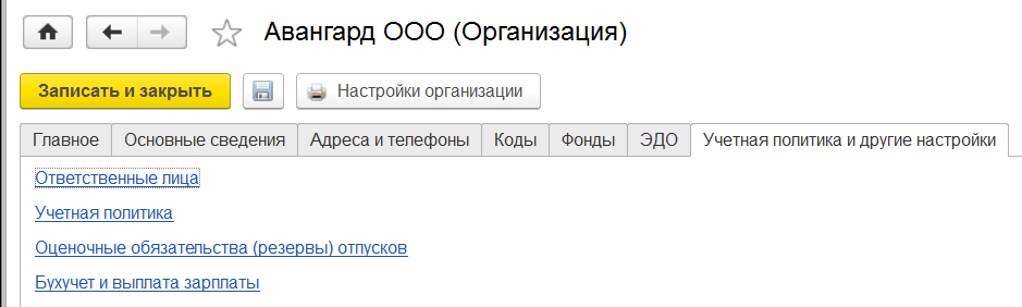 Рассмотрим настройки организаций на примере уже имеющейся в учебной базе организации "Авангард".