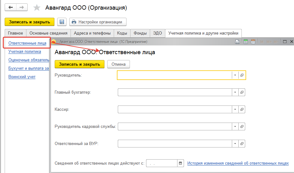 Для того чтобы в печатных формах документов и отчетах указывалось то лицо, которое будет подписывать данный документ, необходимо заполнить сведения о руководителях организации по ссылке "Ответственные лица".