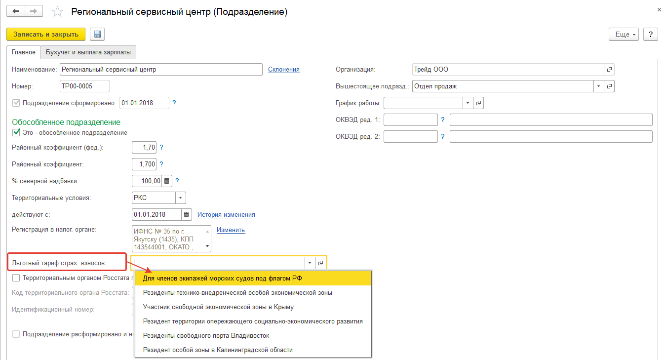 Если в сложных климатических условиях работают только сотрудники одного или нескольких подразделения, то значения районных коэффициентов и территориальных условий для стажа в ПФР следует заполнять только для таких подразделений (в настройках организации только проставляются флажки о наличии таких надбавок).