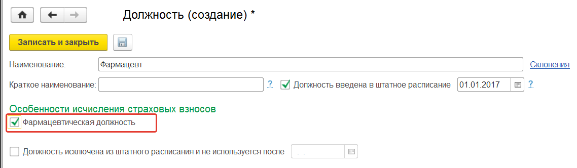 - Есть фармацевты – проставляется для аптечных организаций, где есть сотрудники-фармацевты, флажок дает право применять пониженный тариф страховых взносов. Помимо данной настройки в справочнике "Должности" соответствующие должности необходимо будет отметить флажками;