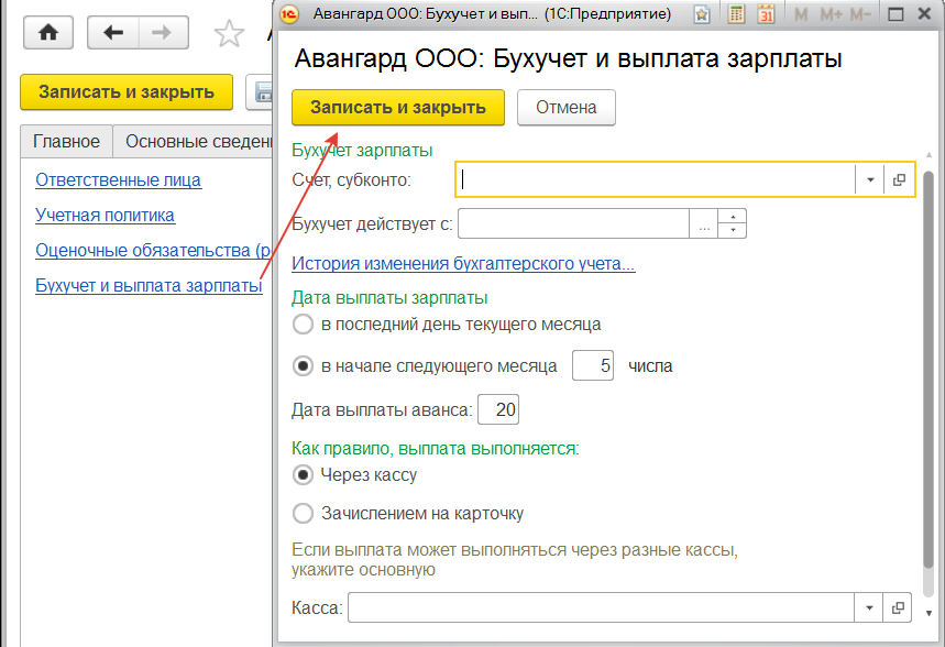 В разделе "Выплата" указываются сроки выплаты заработной платы (они потребуются для автоматической регистрации даты удержания НДФЛ с доходов сотрудников по умолчанию), а также порядок выдачи денег сотрудникам: через кассу (в этом случае заполняется основная касса) либо по зарплатному проекту (в этом случае указывается ссылка на основной зарплатный проект).