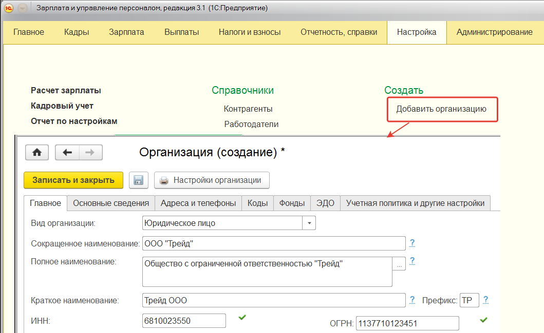 Добавим новую организацию ООО "Трейд" и выполним для нее следующие настройки: