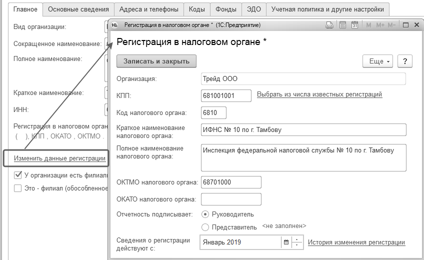 Б) Запишем предварительно данные организации. Затем внесем сведения о регистрации в ИФНС по ссылке "Изменить данные регистрации": КПП 681001001, ИФНС № 10 по г. Тамбову, ОКТМО 68701000 с 01.01.2019 – как на рисунке ниже.