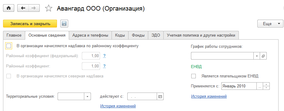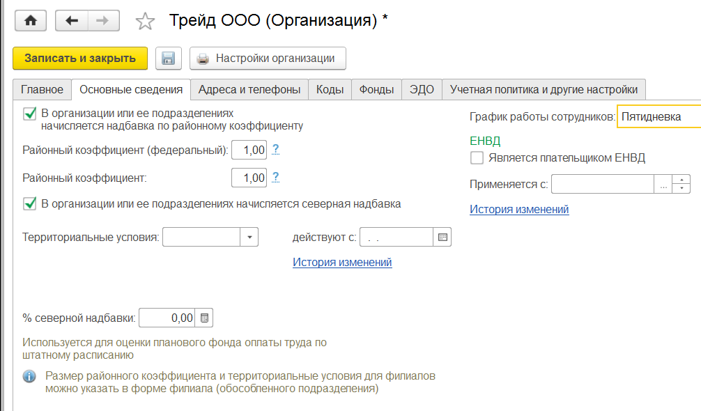 Здесь же можно указать основной график работы, который по умолчанию будет присваиваться все сотрудникам организации (например, пятидневный график при 40-часовой рабочей неделе). Также для организаций, которые применяют систему налогообложения в виде ЕНВД, можно указать соответствующую настройку.