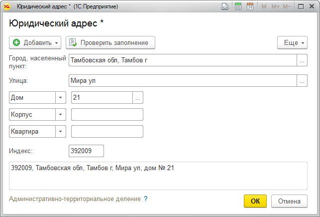 Адрес следует вводить выбором из адресного классификатора (можно набирать название на клавиатуре, далее будет автоматически подбираться информация по классификатору).
