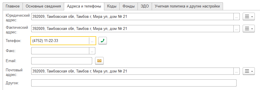 Д) Заполним контактную информацию (ввод данных с использованием адресного классификатора): адрес - 392009, Тамбовская обл., Тамбов г, Мира ул., дом № 21, тел. (4752) 11-22-33