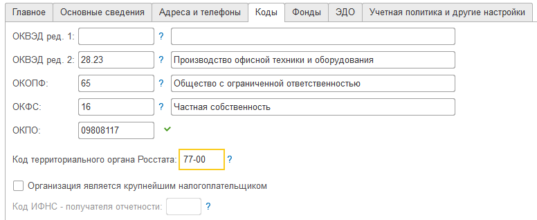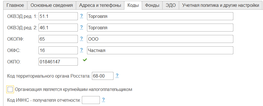 Е) Укажем на закладке "Коды" информацию для отчетности (наименования сокращены в рамках учебного курса)