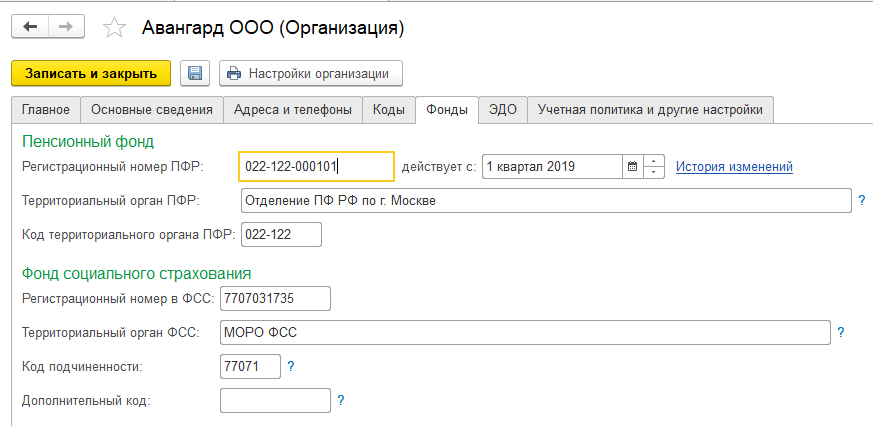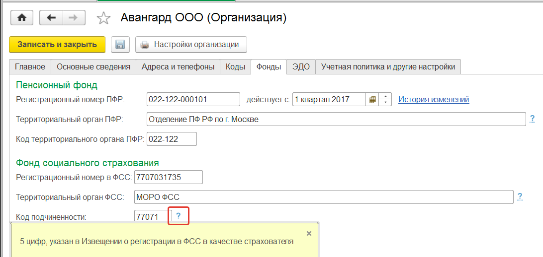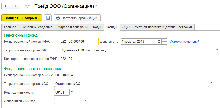 Ж) На закладке "Фонды" заполним сведения о регистрации в ПФР и ФСС: