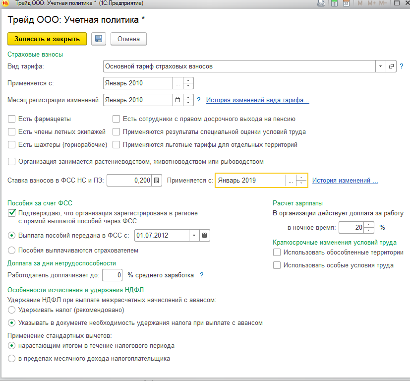 - Применяются льготные тарифы для отдельных территорий – эта настройка позволяет применять пониженный тариф страховых взносов для сотрудников обособленных подразделений данной организации;