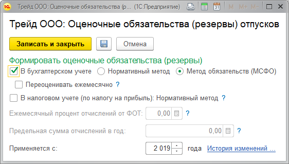 И) Заполним настройки оценочных обязательств. В данной организации используется метод обязательств, резервы в налоговом учете не формируются.