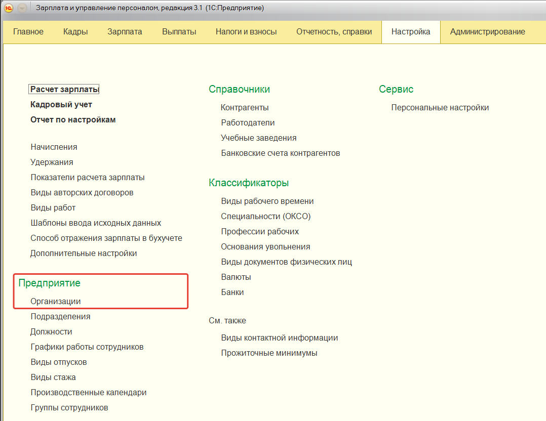 Учет и расчет заработной платы в программе ведется в разрезе организаций. Список организаций и индивидуальных предпринимателей данной информационной базы хранится в справочнике "Организации". Количество организаций, по которым можно вести учет в одной информационной базе, практически неограниченно. Сведения об организации могут быть перенесены из другой базы, введены с использованием помощника начальной настройки или же непосредственно в форме справочника. Доступ к данным организации осуществляется из раздела "Настройка/ Реквизиты организации (либо "Организации", если их несколько)".