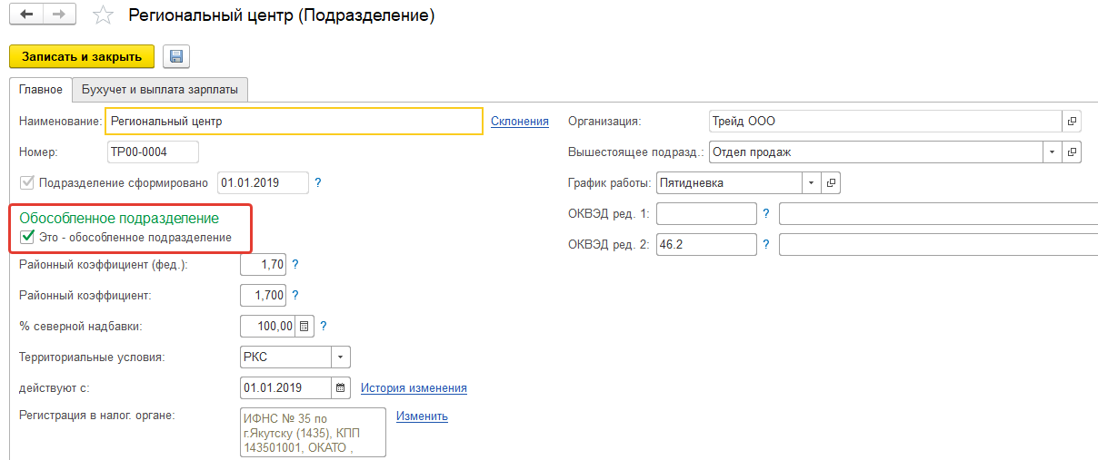 Г) Обособленное подразделение будет без выделения на самостоятельный баланс, и кроме того, оно будет находиться в районе Крайнего Севера. На закладке "Основные сведения" укажем соответствующие настройки.