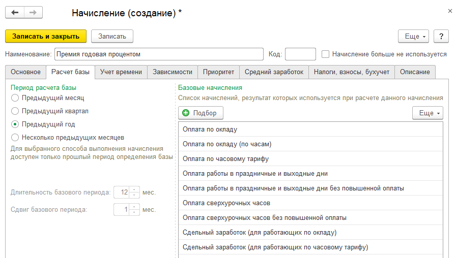 Заполним закладку "Расчет базы" - в качестве базовых начислений будет использоваться основная оплата и оплата за работу сверх нормы времени.