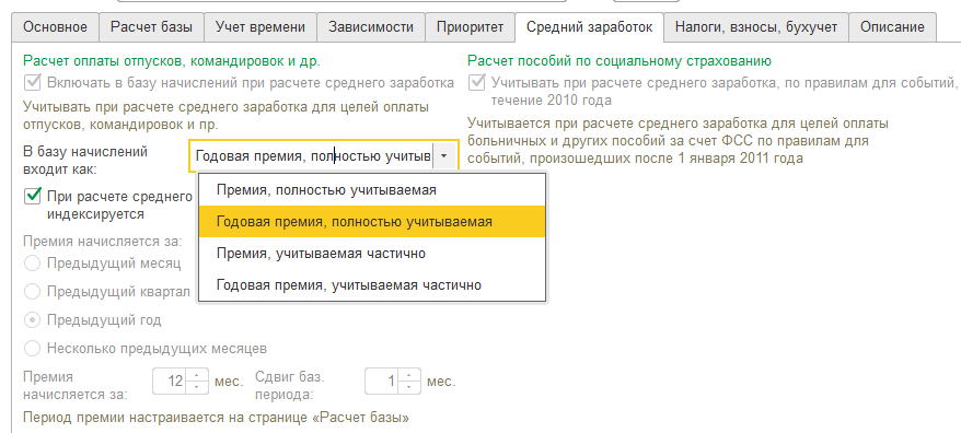 Начисление в среднем заработке может учитываться как основной заработок (в полном объеме), как премии (полностью либо частично) либо годовые премии (полностью, либо частично). При этом настройка по премиям доступна, если в списке начислений есть хотя бы один вид расчета с назначением "Премия".