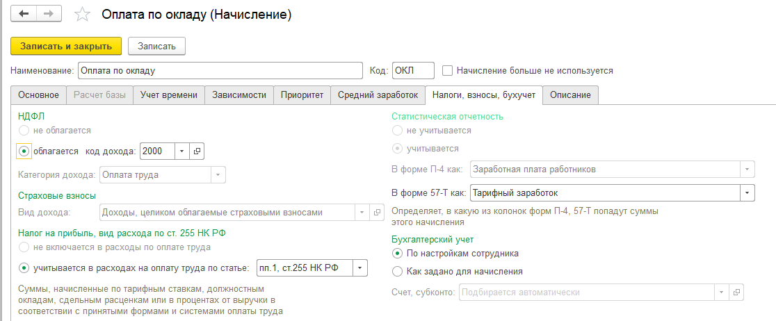 Если начисление в налоговом учете относится к расходам на оплату труда, то требуется установить переключатель на значение "Учитывается в расходах на оплату труда по.." и выбрать нужный пункт ст.255 НК РФ. Если же начисление не принимается в качестве расходов на оплату труда в налоговом учете, переключатель устанавливается на значение "Не включается в расходы на оплату труда". Данная информация используется при отражении зарплаты в учете для бухгалтерии. Однако непосредственно налоговый учет по прибыли описается на настройки статей затрат и других аналитических справочников.
