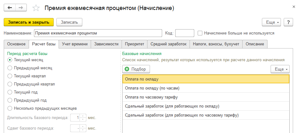 Длительность базового периода (количество месяцев) может участвовать не только при расчете самого начисления, но и среднего заработка для начислений, назначенных и настроенных как премии.