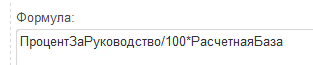 Формула расчета: % за руководство / 100 * Расчетная база (в которую и входят оклад, сделка и пр.). Показатель "Расчетная база" – типовой, и потребует заполнения закладки "Расчет базы", показатель "Процент за руководство" необходимо будет добавить самостоятельно.