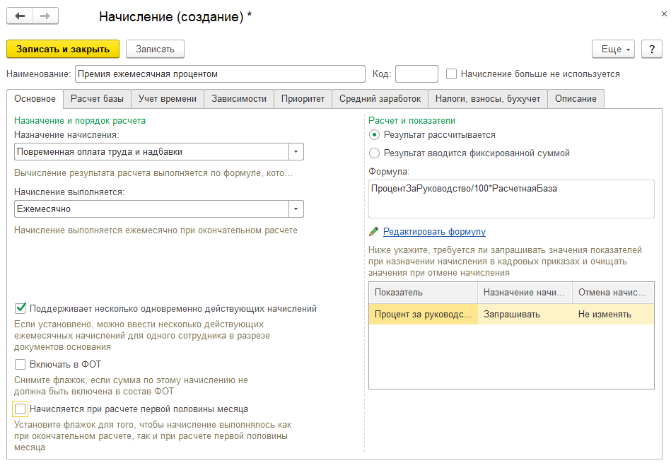 В) Для того, чтобы рассчитать это начисление нам потребуется дополнительный показатель "Процент за руководство", добавим его в список показателей и укажем следующие настройки: